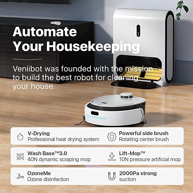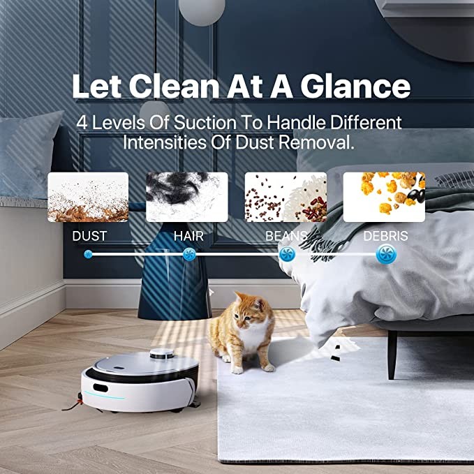 更*的家居 — 这款机器人真空吸尘器和拖把可为您节省数小时的清洁时间。 强大的吸力可捕捉从细小的灰尘到西瓜种子大小的物体的所有东西。 3 升大容量水箱无需加水,可持续使用 3-5 天。 这款拖把和真空机器人可清洁高达 4,300 平方米。 无需抬起手指即可
