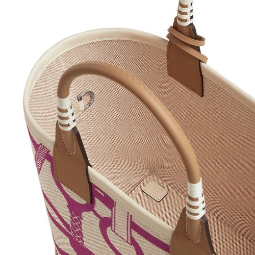 【包税】HERMES/爱马仕24新款 女士米白色帆布粉紫色图案手提包H083621CKAC