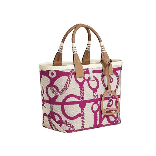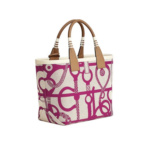 【新品包包】HERMES/爱马仕24新款 女士米白色帆布粉紫色图案手提包H083621CKAC